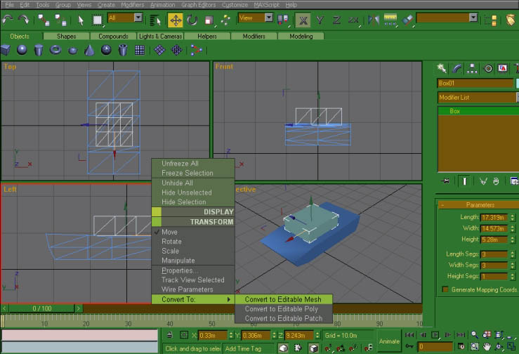 Create another box object, remember to give it some segs! It should automatcally have as many segs as the last cube object was set to have. When you're happy with how many segs it has, right click your object and convert it to 'Editable Mesh'.